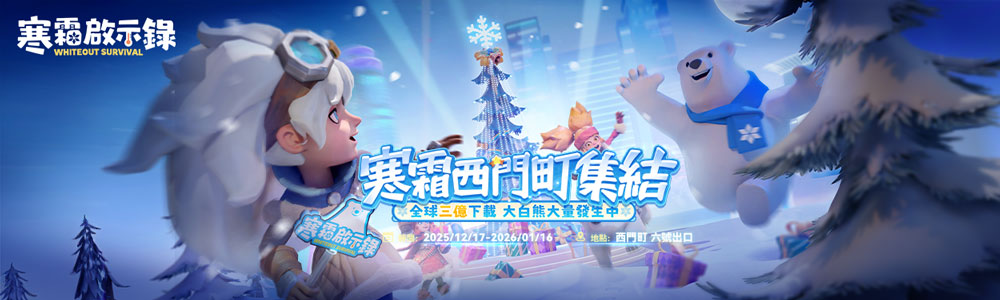 寒霜降臨西門町,陪你從年末跨越到年初,邀領主一起歡慶 3 億下載里程碑!自 12 月 17 日起,全新打卡點「寒霜地球應援台」即將聳立於西門町 6 號出口前,寒霜大白熊偶與人氣啦啦隊女孩更將在此等候領主,一起手握寒霜白熊應援手燈變身大白熊,拍照玩樂一次滿足!