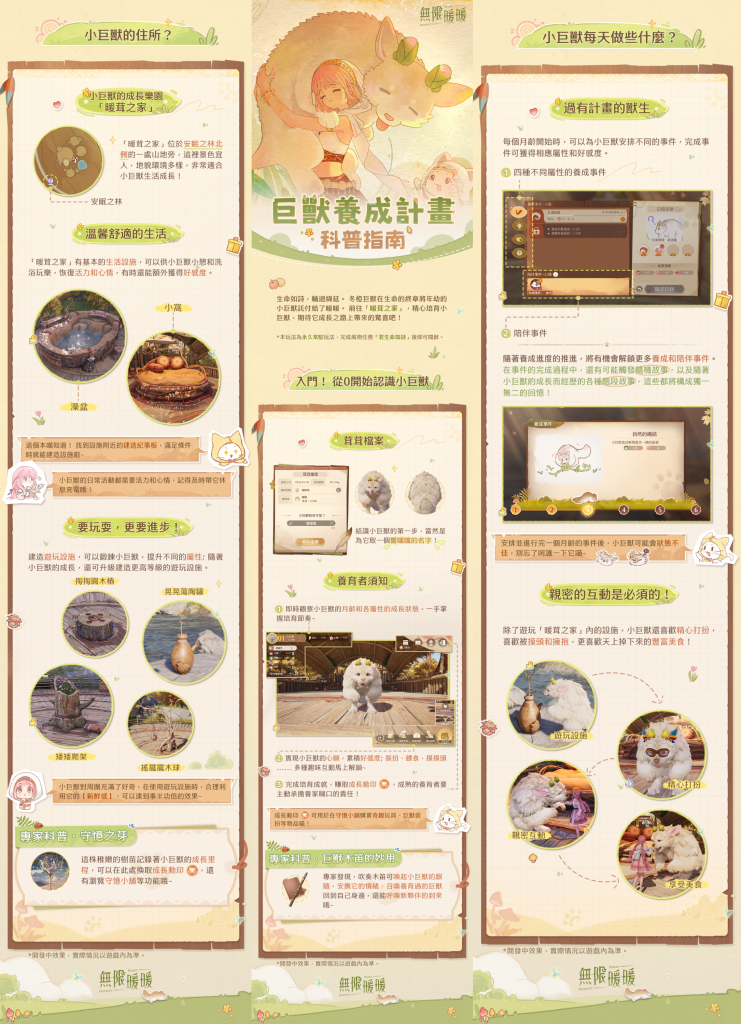 完成風物任務後,即可前往安眠之林北側的「暖茸之家」,體驗全新常駐養成玩法。搭配師可觀察小巨獸月齡與屬性成長,透過裝扮、餵食、摸頭等互動提升好感度,並在「成長里程碑」「茸茸心願」「林間逸事集」中領取【成長勳印】與各式獎勵。
