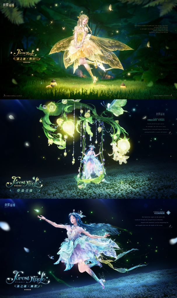 五星套裝「森之漣」集齊後可解鎖能力「芳間巡遊」,大幅提升植物採集體驗,進化3可獲得全新妝容與待機動作。共鳴滿 160次還可獲得擺飾「夢盈青藤」。