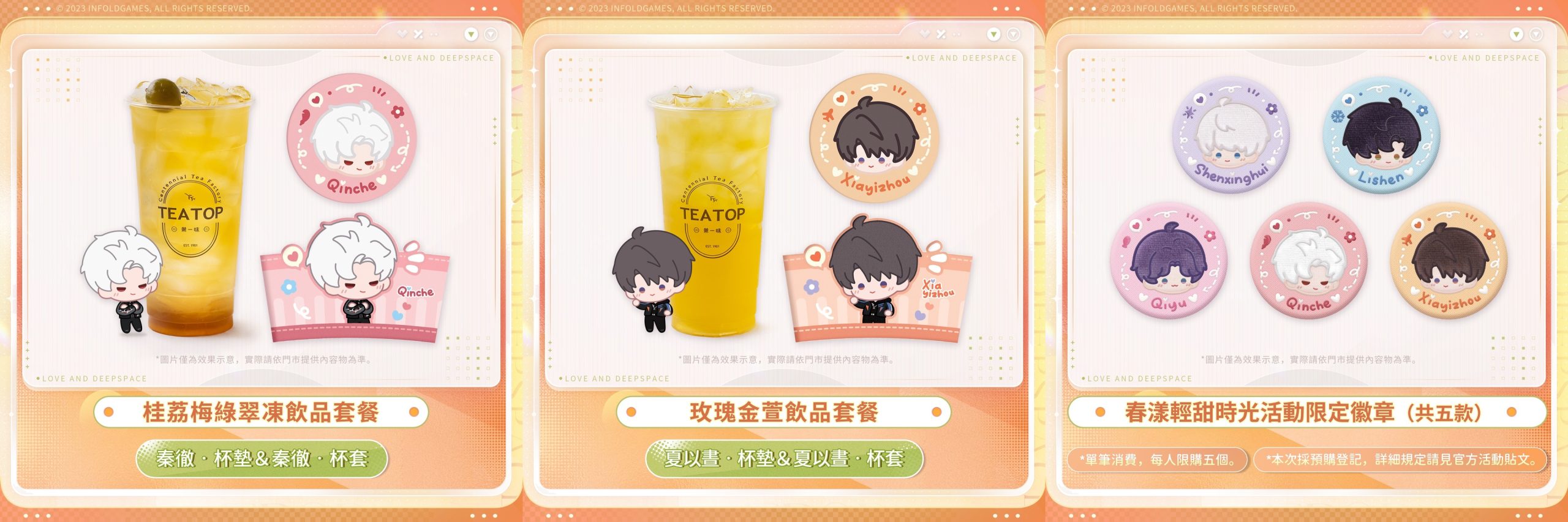 戀與深空聯名飲品套餐(飲品+杯墊+杯套),共五款套餐,每套NT$115元,每位獵人單筆消費限購買5套。